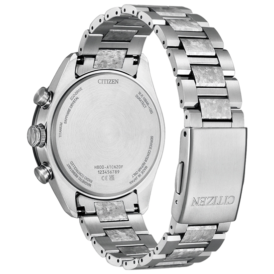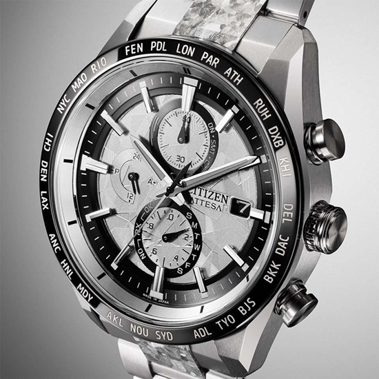 シチズン独自の技術で開発した結晶チタニウムを中駒に採用。デュラテクトプラチナを重ねることで結晶模様がプラチナの輝きをまとい、存在感を放ちます。