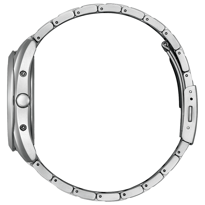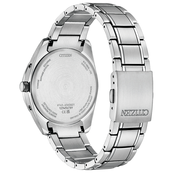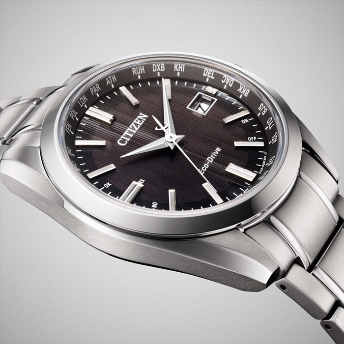 ケースとバンドにスーパーチタニウム™を採用した、ベーシックな3針タイプのエコ・ドライブ電波時計。ベゼルとバンドにはミラー面も取り入れ、上質感を演出しました。落ち着いたカラーで、縦方向にパターンをあしらった文字板はシンプルで見やすく、幅広いシーンでお使いいただけるデザインです。