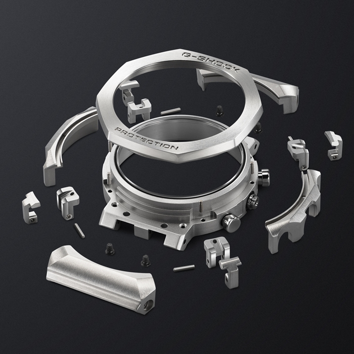 複雑な形状のケースとベゼルは27個の部品で構成。パーツごとに細部まで研磨を施すことができ、高い質感に仕上げました。また、強度の高いマルチガードストラクチャーで、ベゼルトップにはプラチナと同等の輝きを持つといわれる「コバリオン」を、バンドには高い硬度を持ちながら加工性に優れたチタン合金「DAT55G」を採用。