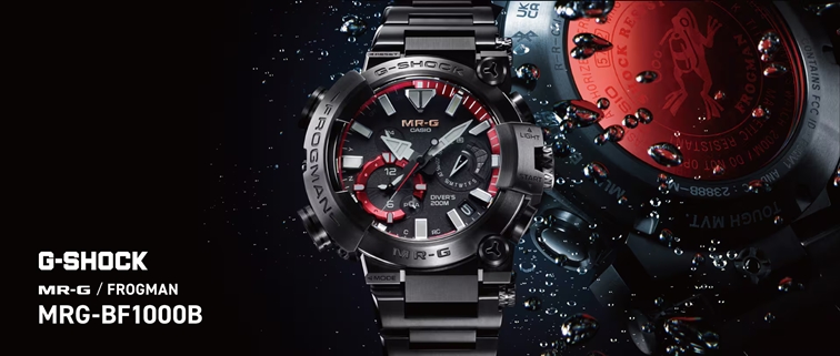 MRG-BF1000は、ISO規格200m潜水用防水機能を持つ本格ダイバーズウオッチ「FROGMAN」にチタン外装を採用し、丹念な仕上げを施したMR-Gです。