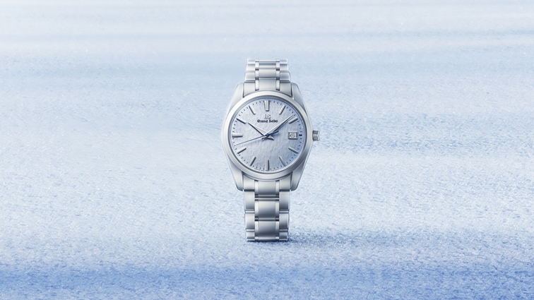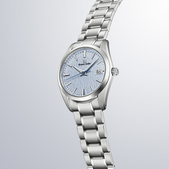 風紋が刻まれた雪のような独特なダイヤル模様は、信州の山々に積もった雪から着想を得たものです。この繊細な質感のダイヤルに、澄んだライトブルーのカラーリングを施しました。雪原を思わせるパターンと、清らかな水色のコントラストが、腕元にさりげない個性と洗練をもたらします。グランドセイコー専用の年差クオーツムーブメント「キャリバー9F62」を搭載し、37mmサイズのケースに仕上げました。ケースとブレスレットには、ステンレススチールと比べて約30%軽量で、耐傷性・耐食性に優れるブライトチタンを採用することで、軽くて心地よい装着感を実現しました