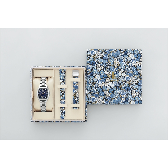 リバティ社のアーカイブデザインをベースにした密集した花々を描いた人気のデザイン、「チャイブ」を採用。「チャイブ 」に合わせ、腕時計のダイヤルには深みのあるネイビーカラーを、秒針と7時位置のクローバー形の金属パーツにはイエローゴールドカラーを取り入れました。