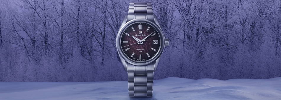 スプリングドライブの製造地である信州地方の樹氷の森が静かに目覚める夜明けの神秘的な情景を、精緻な型打模様とバイオレットカラーの繊細なグラデーションで表現しました。